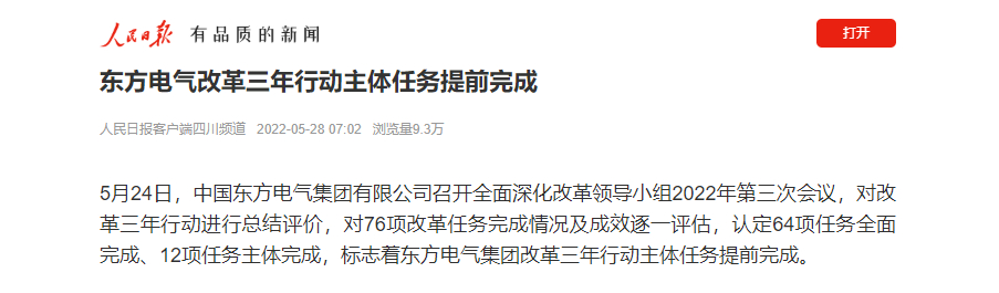 5月24日,中国东方电气集团有限公司召开全面深化改革领导小组2022年第三次会议,对改革三年行动进行总结评价,对76项改革任务完成情况及成效逐一评估,认定64项任务全面完成、12项任务主体完成,标志着东方电气集团改革三年行动主体任务提前完成。