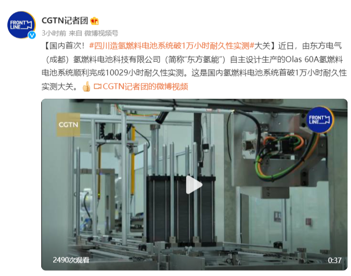 [CGTN]国内首次!四川造氢燃料电池系统破1万小时耐久性实测大关