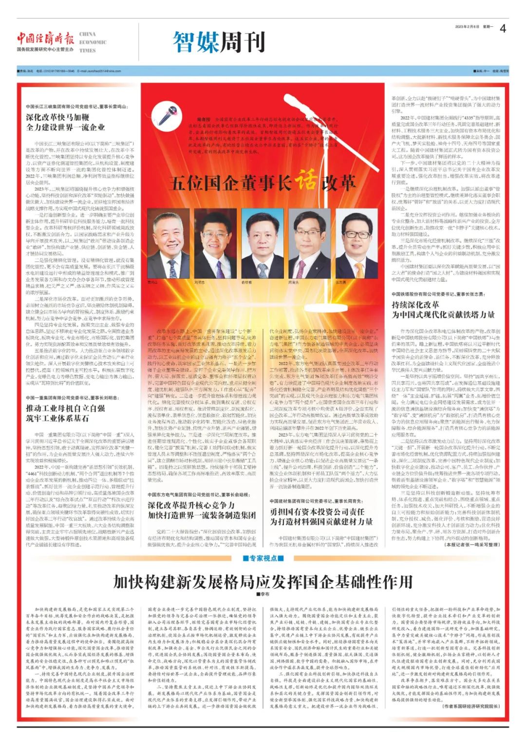 作为改革的践行者,企业的行动影响着改革的成效。2月6日,中国经济时报邀请五位国企董事长话改革。东方电气集团党组书记、董事长俞培根介绍了集团公司以党的二十大精神为指引,坚决贯彻落实党中央、国务院决策部署,全面深化改革,加快建设世界一流企业的相关情况。