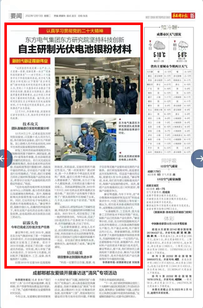 [华西都市报]东方电气集团东方研究院坚持科技创新 自主研制光伏电池国产化银粉材料