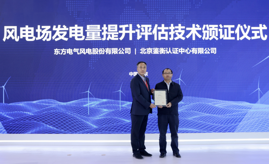 北京鉴衡认证中心向东方风电颁发《风电场发电量提升评估技术》认证证书。