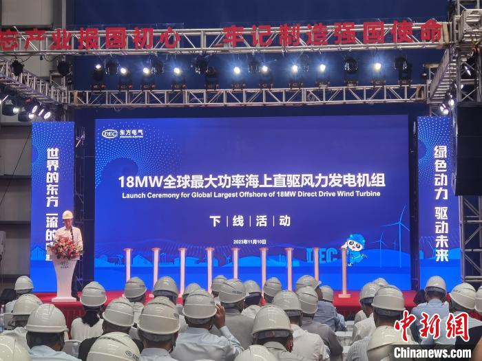 11月10日,18兆瓦直驱海上风电机组在福建福州福清市东方电气风电(福建)有限公司生产基地下线。中新网记者龙敏摄