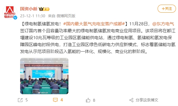 【绿电制氢储氢发电!#国内最大氢气充电宝落户成都#】11月28日,@东方电气签订国内首个且容量功率最大的绿电制氢储氢发电商业应用项目。该项目将在都江堰建设10兆瓦等级的工业园区氢储能供电站,通过绿电制氢、氢储能和氢发电保障园区峰电时段供电,打造工业园区绿色低碳电力供应新模式,标志着氢储能与氢发电从示范项目阶段迈入氢能的一体化、规模化、商业化的新阶段。
