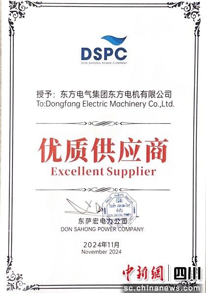 中新网四川新闻11月8日电 近日,2024东方电机贯流式机组技术创新交流大会在老挝召开。来自老挝政府、电站投资方、用户和建设方等多家单位的40余位嘉宾,共同探讨贯流式机组最新技术研发成果和应用成果。会上,东萨宏电力公司向东方电气集团东方电机有限公司(以下简称东方电机)颁发“优质供应商”证书。