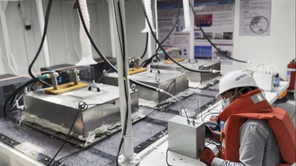 在紧张的试验进程中,“东福一号”屹立于海天之间,持续保持运行开展海上无淡化制氢。刚开始几天试验很顺利,海面风平浪静。第5天开始,海浪翻滚,狂风将“东福一号”颠得左摇右摆,仿佛随时都有可能被吞噬。舱内,闷热缺氧的环境中,团队成员依然紧盯着制氢设备,海浪的撞击让他们的胃里翻涌不止。陈屹是其中一员,他跪趴在栏杆边,扶着栏杆便吐了起来,海风带来的咸腥湿气让他的不适更加剧烈,但他眼神中依然透露出坚定与执着。