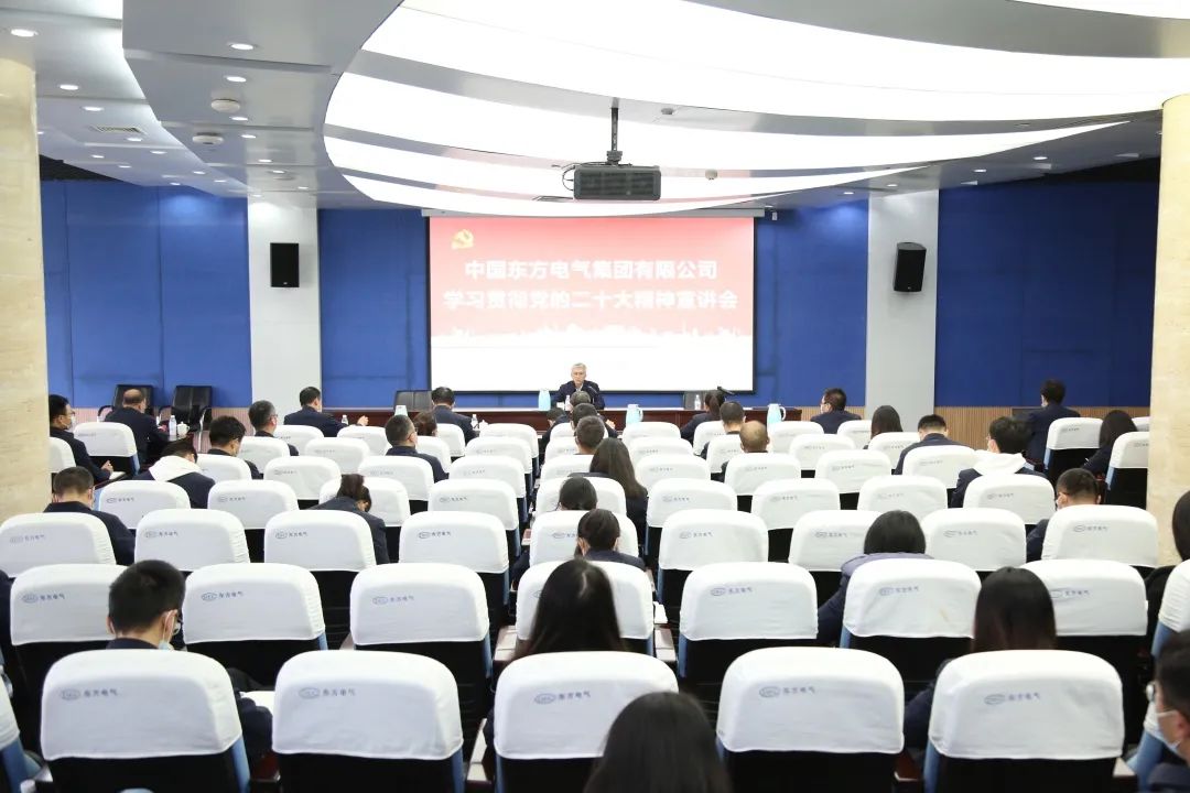 11月10日,党的二十大代表,集团公司党组书记、董事长俞培根深入“绿色智造”一线,为东方电机党员干部职工宣讲党的二十大精神。俞培根从“七个深刻把握”对全集团结合实际深入贯彻落实党的二十大精神作出系统安排,特别是对东方电机在加快建设世界一流企业、提升科技创新支撑作用、加快绿色低碳转型发展、释放企业改革活力动力、以高质量党建引领保障高质量发展等方面提出明确要求。