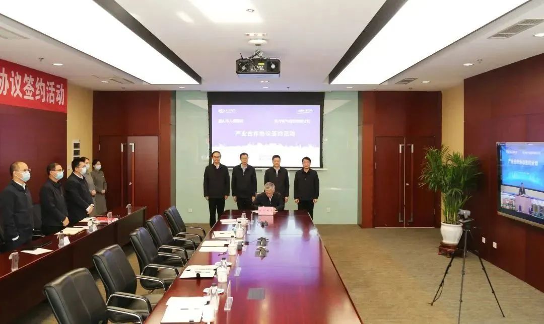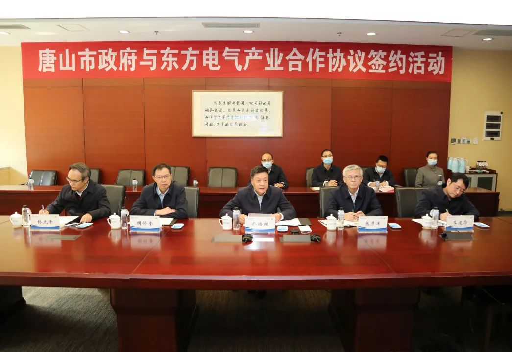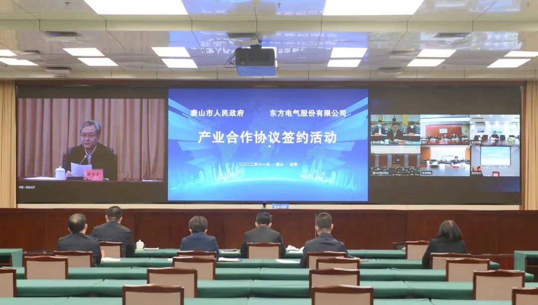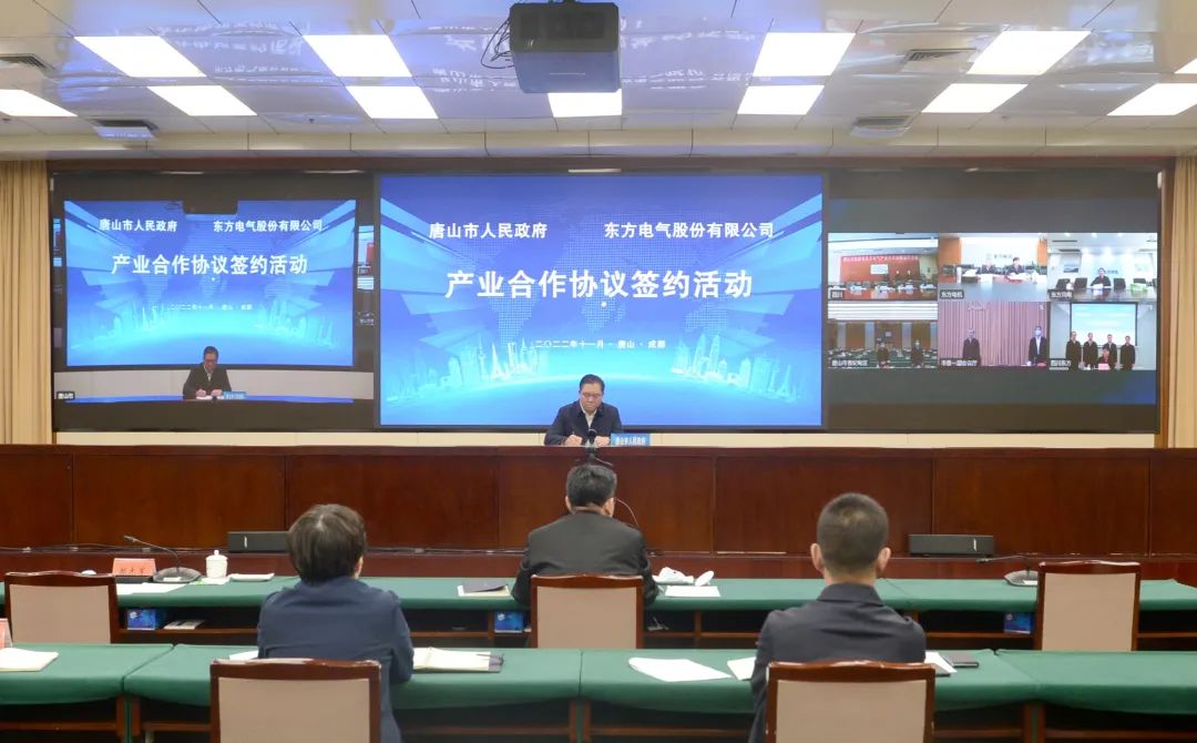 在俞培根、武卫东等领导见证下,东方电气股份有限公司与唐山市人民政府通过云签约方式签署产业合作协议。张彦军、郝志军代表双方签字。