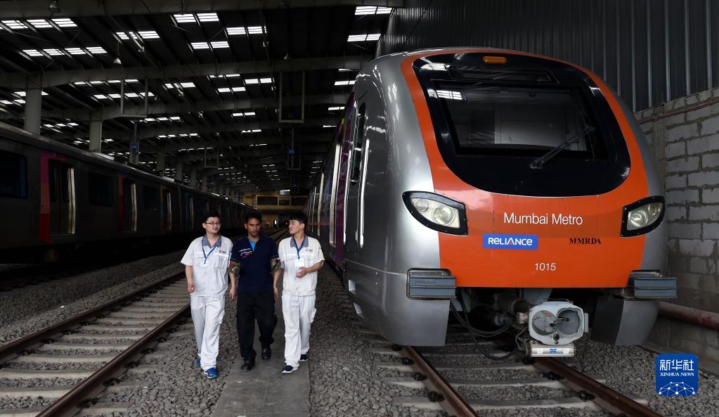 2018年6月27日,在印度孟买,中印双方工作人员在孟买地铁一号线车辆段工作。该地铁线路车辆由中车南京浦镇车辆有限公司制造。新华社记者张迺杰摄