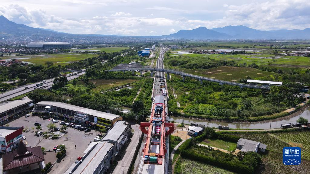 这是2022年5月25日在印度尼西亚万隆拍摄的雅万高铁4号梁场万隆方向架梁通道上最后一榀箱梁架设现场(无人机照片)。新华社记者徐钦摄