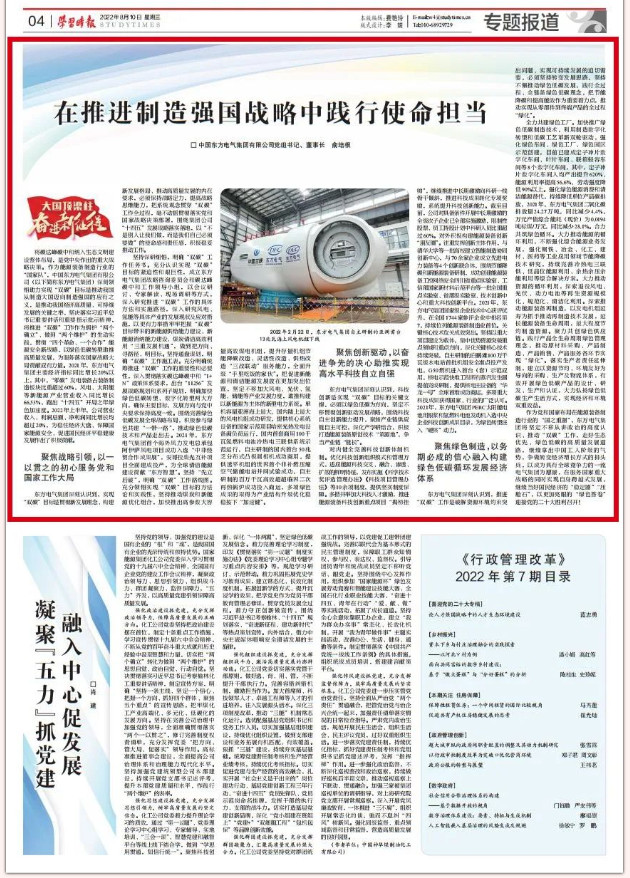 8月10日,《学习时报》刊发东方电气集团党组书记、董事长俞培根署名文章《在推进制造强国战略中践行使命担当》,介绍东方电气集团推进“双碳”工作,以绿色低碳转型助推高质量发展等情况,全文如下。