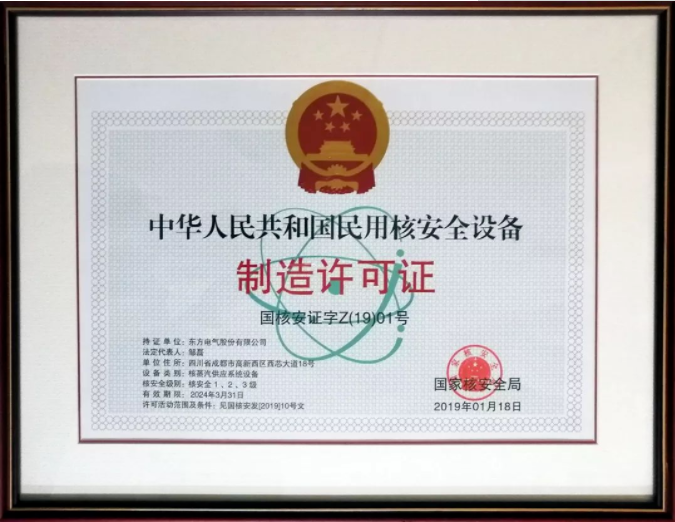 构建核电完整产业链,打造核电设备成套供货能力是东方电气人的矢志追求。2019年1月21日,国家核安全局向东方电气集团颁发了全国首张核蒸汽供应系统设备制造许可证,标志着东方电气集团成为国内首家具有核蒸汽供应系统设备成套供货资质的装备制造集团。至此,经过十年努力、五年试点,东方电气核蒸汽供应系统设备成套供货许可取证工作圆满完成。东方电气集团以此为新起点,充分发挥成套供货优势,严格遵守核安全法规,切实强化核安全文化意识,不断优化管理模式,持续设计制造能力和水平。