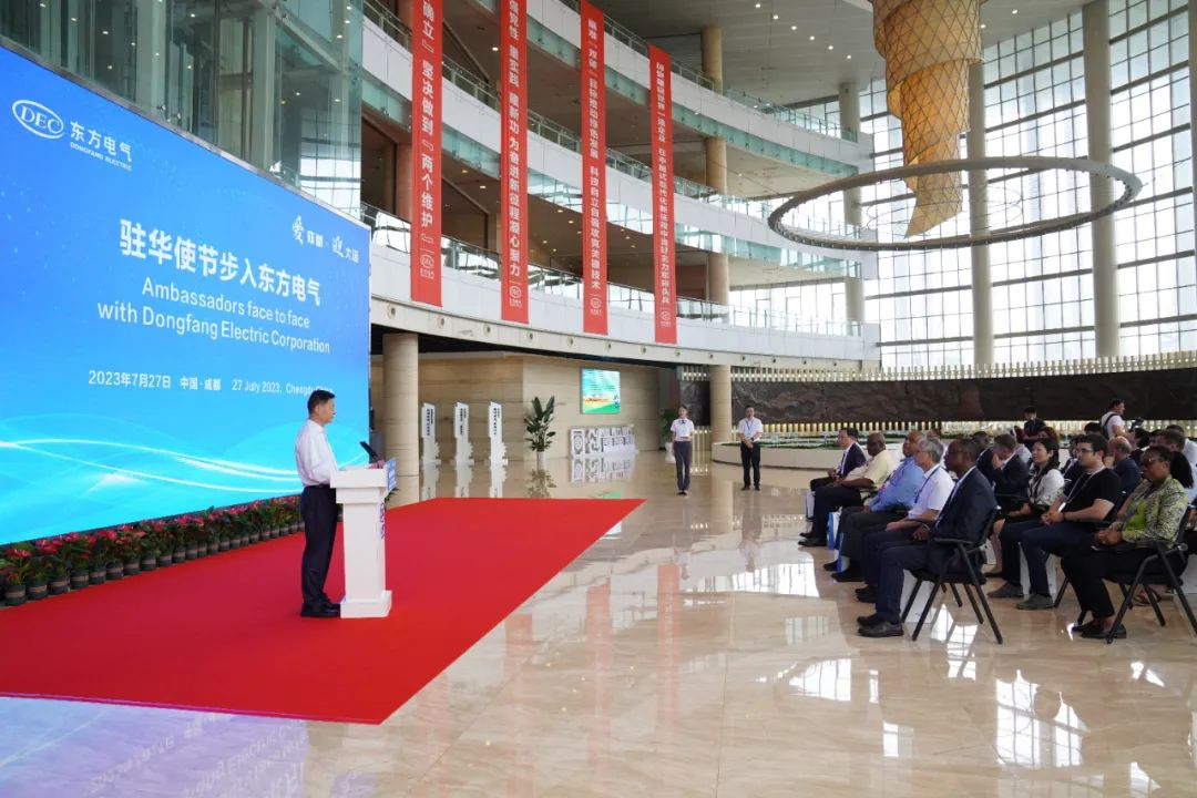 俞培根在致辞中对各位使节朋友们的到来表达了最热切的欢迎,向各国政府和合作伙伴给予东方电气集团的大力支持和帮助表示衷心的感谢。俞培根简要介绍了东方电气产业发展情况及海外业务发展情况,表示东方电气集团以“绿色动力、驱动未来”为使命,将牢牢把握绿色、低碳、智能发展趋势,加快理念、科技、模式、产品等全方位创新,以更先进的理念、更完善的商业模式、更优质的产品、更卓越的服务,为高质量共建“一带一路”作出更大贡献;愿与世界各国携手共商,扣紧合作纽带,以共商求共识,以合作谋共赢,深化合作关系,拓宽合作领域,提高综合一体化服务能力,促进共同发展,全力打造更多民生项目,切实履行社会责任,推动合作成果更多更公平地惠及每一个国家、每一个人。东方电气集团将继续秉承“共创价值、共享成功”的合作理念,与各国一道,开展共建“一带一路”等方面合作,共育新机,共开新局,共创未来。