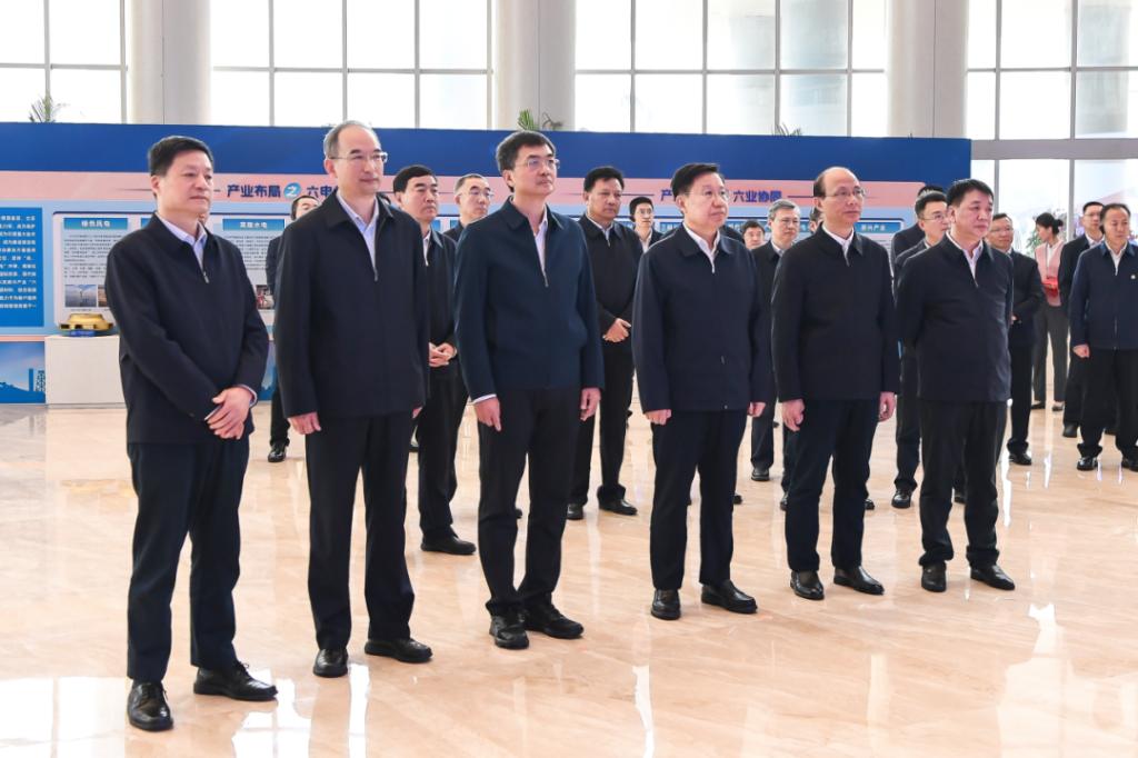 在东方电气科技展示厅,领导们深入了解东方电气集团在科技创新、“六电六业”产业发展等方面取得的最新成果,并对企业始终坚持自主创新表示赞扬。陈刚、吴晓军不时询问企业经营、产品产业,尤其是氢能储能等新产业发展情况,对东方电气集团在发展壮大中孕育出的“东汽精神”以及在能源装备制造领域展现出的硬核实力给予高度评价,关切东方电气集团在青发展情况,鼓励企业聚焦推进“环柴达木区域氢能应用示范基地”、建设“国内最高海拔风电主机与叶片装备制造产业基地”,发挥多种储能技术和光热系统集成技术优势,积极参与和打造大型储能示范应用基地和光热示范基地。王晓晖、黄强表示,东方电气集团是我国能源装备领域的龙头企业之一,要完整准确全面贯彻新发展理念,更好发挥中央企业科技创新、产业引领、安全支撑作用,积极参与川青建设,共同写好打造国家清洁能源产业高地这篇大文章,助推新时代川青合作取得更加丰硕成果,助力两域经济社会高质量发展。
