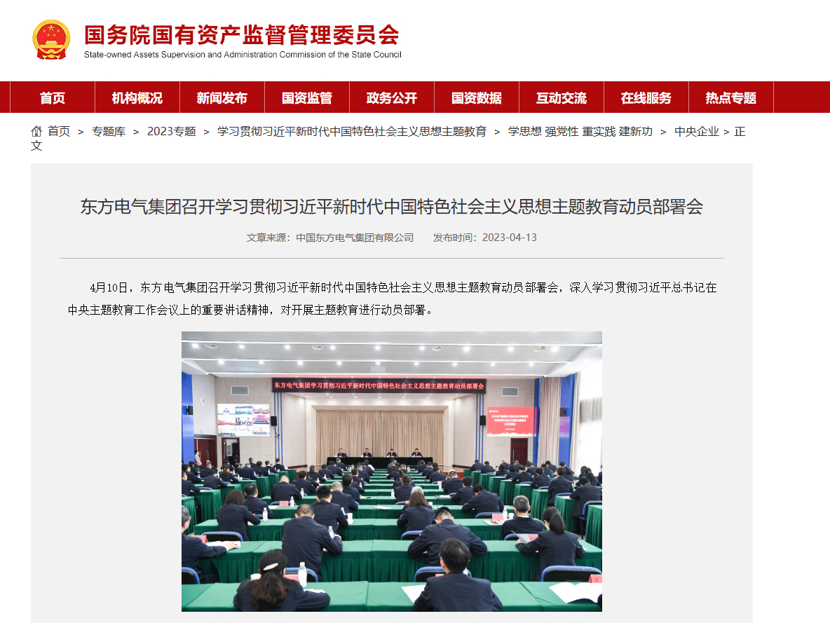 4月10日,东方电气集团召开学习贯彻习近平新时代中国特色社会主义思想主题教育动员部署会,深入学习贯彻习近平总书记在中央主题教育工作会议上的重要讲话精神,对开展主题教育进行动员部署。