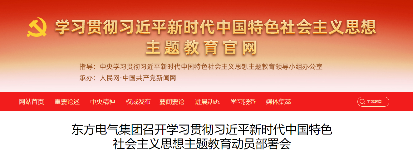 4月10日,东方电气集团召开学习贯彻习近平新时代中国特色社会主义思想主题教育动员部署会,深入学习贯彻习近平总书记在中央主题教育工作会议上的重要讲话精神,对开展主题教育进行动员部署。中央第四十六指导组组长舒印彪出席会议并讲话,东方电气集团党组书记、董事长、主题教育领导小组组长俞培根作动员部署讲话。中央第四十六指导组副组长刘续浩和其他成员出席会议。