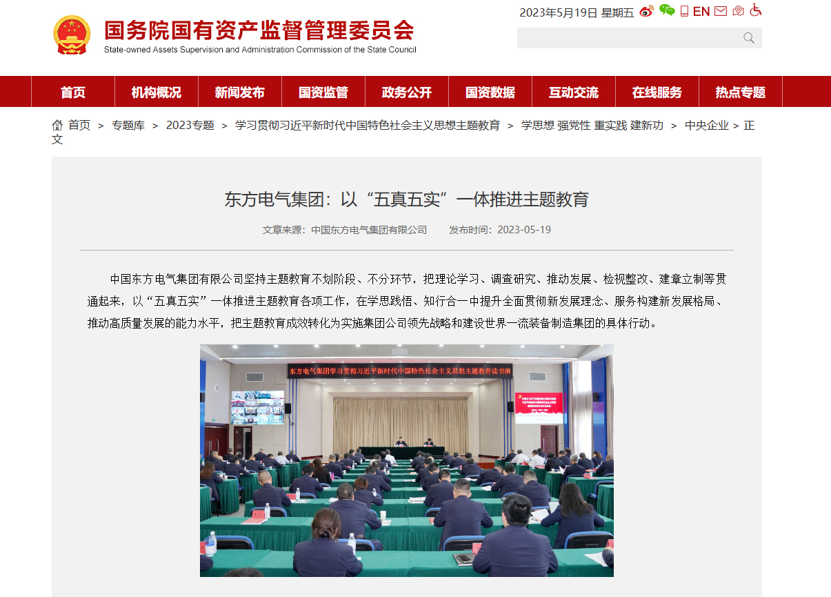 中国东方电气集团有限公司坚持主题教育不划阶段、不分环节,把理论学习、调查研究、推动发展、检视整改、建章立制等贯通起来,以“五真五实”一体推进主题教育各项工作,在学思践悟、知行合一中提升全面贯彻新发展理念、服务构建新发展格局、推动高质量发展的能力水平,把主题教育成效转化为实施集团公司领先战略和建设世界一流装备制造集团的具体行动。