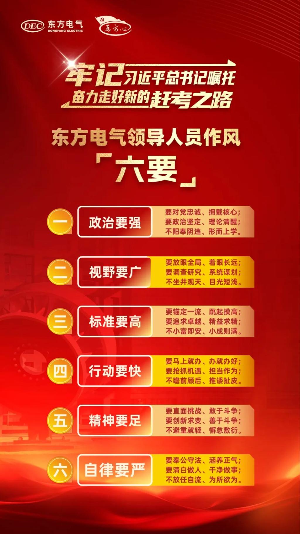 俞培根要求,实现“十四五”发展目标、加快创建世界一流企业需要全体东方电气人接续奋斗,各级领导班子和领导人员是走在前、作表率的“关键少数”,要以东方电气领导人员作风“六要”严格要求自己,焕发出更加昂扬向上的精神状态、展现出更加锐意进取的奋斗姿态,带领广大职工以过硬作风拼搏奋进争先,为加快建设具有核心竞争力的世界一流装备制造集团贡献智慧力量。
