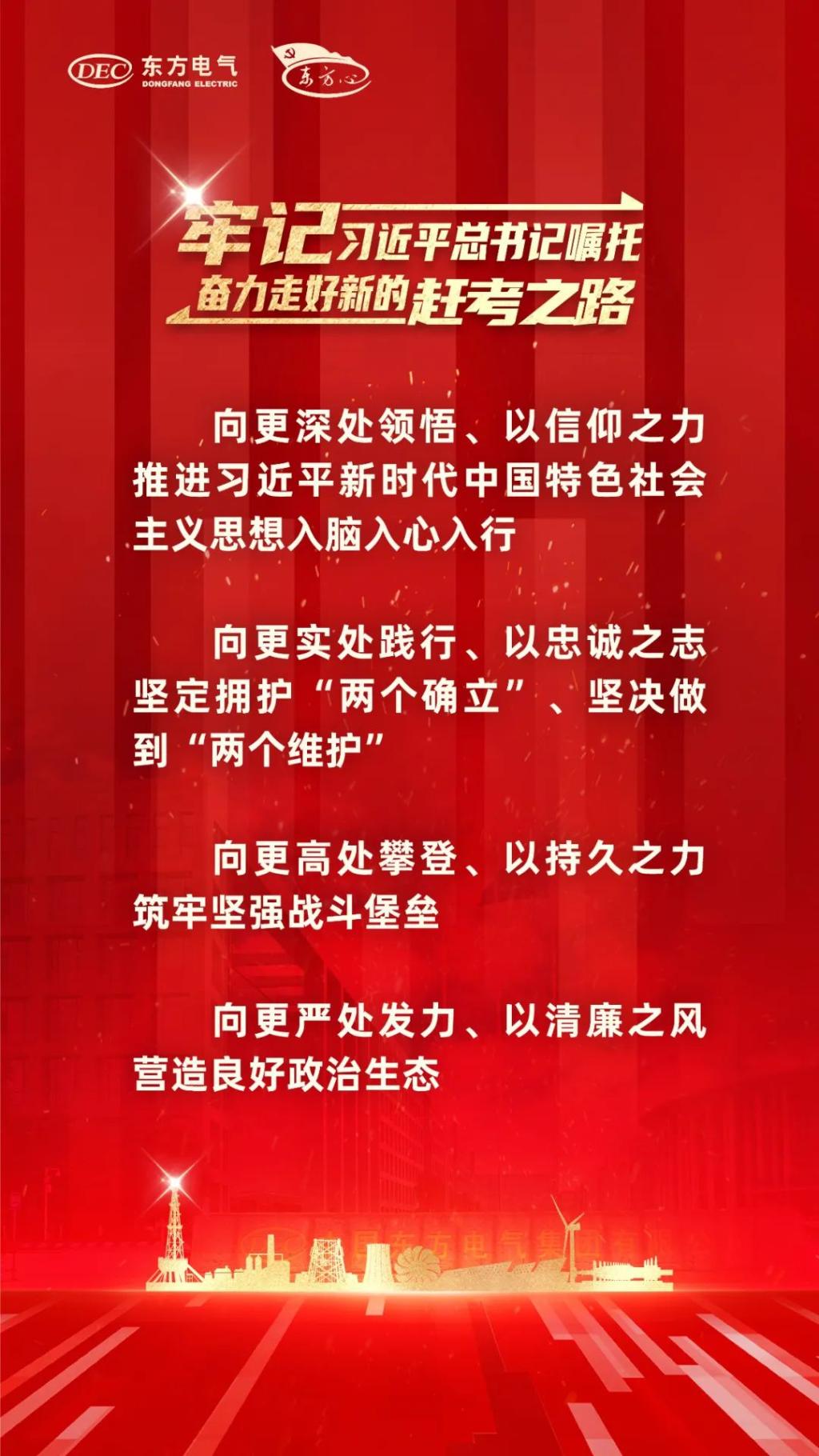 各级党组织和全体党员干部职工务必要以“东方心”党建品牌为引领,以党建“三年攀高计划”“登高而招”为牵引,向更深处领悟,向更实处践行,向更高处攀登,向更严处发力,接续奋斗、勇毅前行,形成全集团共担使命、共谱新篇、携手奋进、万马奔腾的生动局面,以东方电气的“稳”“进”“立”为全国大局作出新的贡献。